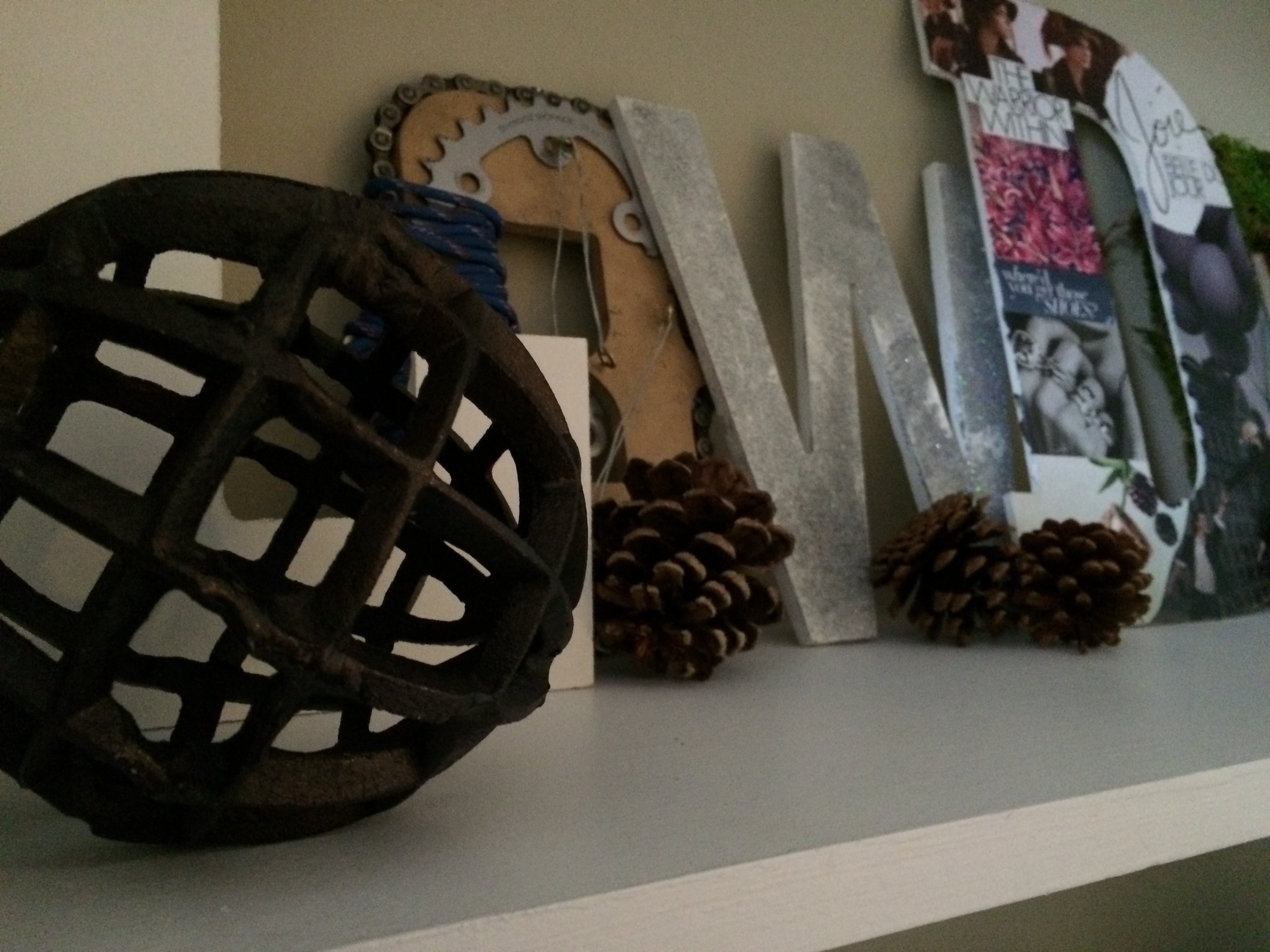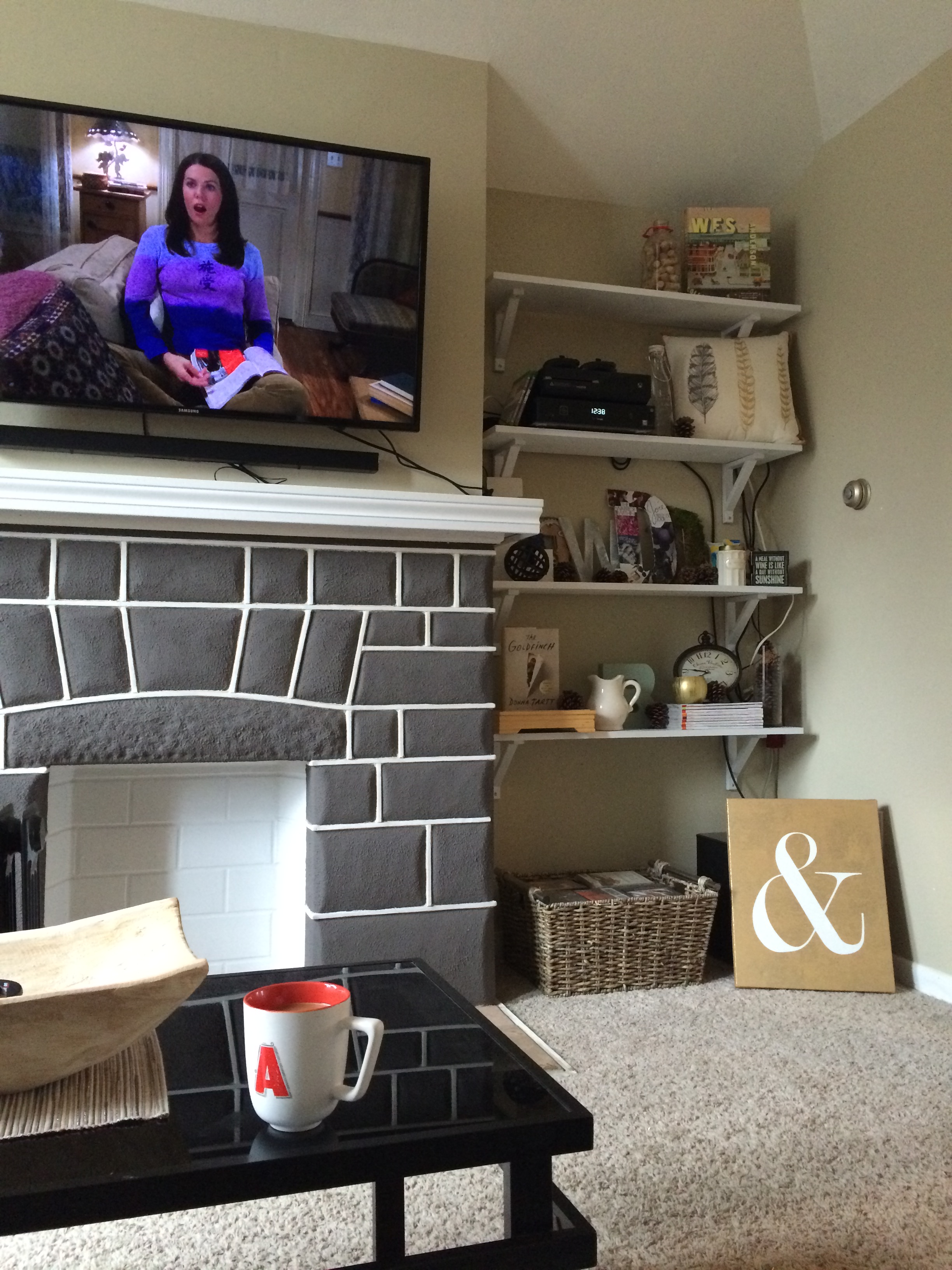 This is the part where I completely passed the baton. It took forever to get four shelves hung perfectly, which I now attribute to the fact that not only is our fireplace not centered in our living room, but the walls themselves are crooked. Pittsburgh homes. I tell ya. Gotta love ’em.